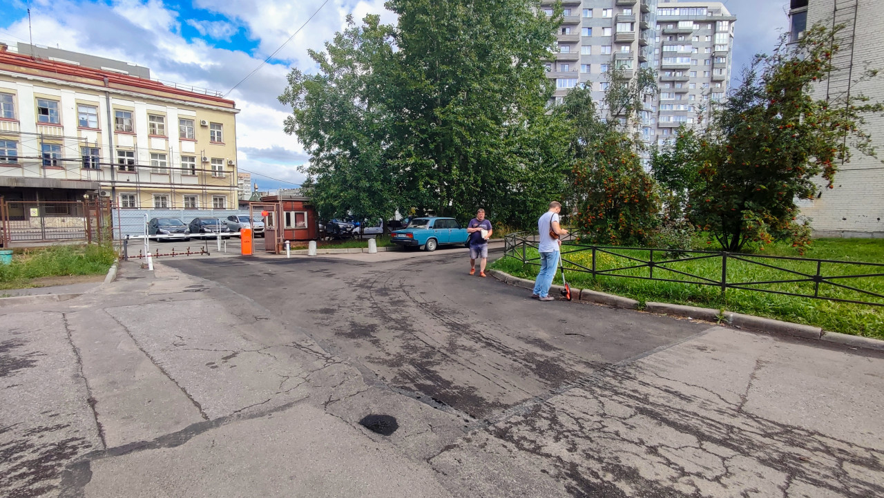На фотографии запечатлены два человека, производящие измерения асфальтового покрытия при помощи измерительного колеса и записей в блокнот. На заднем плане видны старое здание в классическом стиле с колоннами и современный жилой дом. Слева оборудован въезд с автоматическим шлагбаумом, рядом стоит ряд припаркованных автомобилей. Сцена фиксирует процесс обследования состояния дороги в жилом квартале.