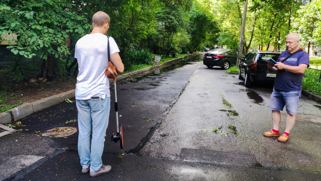 асфальт дорога замеры измерительное колесо курвиметр инженерные работы контроль качества обследование технический контроль люк папка контроль состояния дорожное покрытие автомобили парковка газон деревья кустарники двор придомовая территория диагностика дороги инженерная инфраструктура городская средаПохожие фотографии