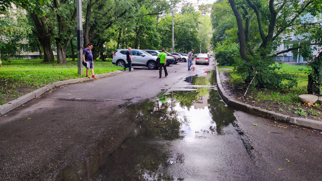 На изображении виден участок дворовой дороги с большими лужами, где несколько мужчин проводят обследование покрытия. Один из них использует измерительное колесо, другие фиксируют данные. На заднем плане припаркованы автомобили и зеленые насаждения. Фото демонстрирует процесс технического осмотра придомовой дороги и выявления дефектов асфальта после дождя.