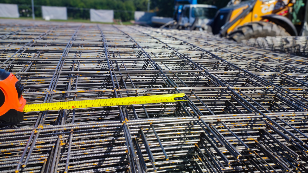 На фото крупным планом изображена арматурная сетка из металлических прутьев, по которой проведен замер при помощи рулетки. На заднем плане размыто видна строительная техника. Снимок демонстрирует процесс измерения строительных материалов на объекте.