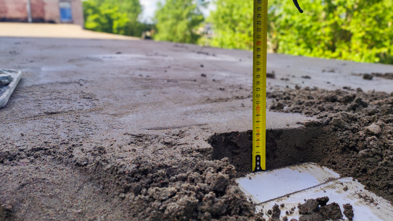 На снимке изображён процесс контроля толщины песчаной стяжки, уложенной на крыше здания. Рулетка зафиксирована вертикально в выемке, демонстрируя точные показатели слоя. На переднем плане заметна песчаная смесь, распределённая по поверхности, а на заднем — кирпичная стена и зелёные насаждения. Фото документирует строительный этап ремонта кровли.