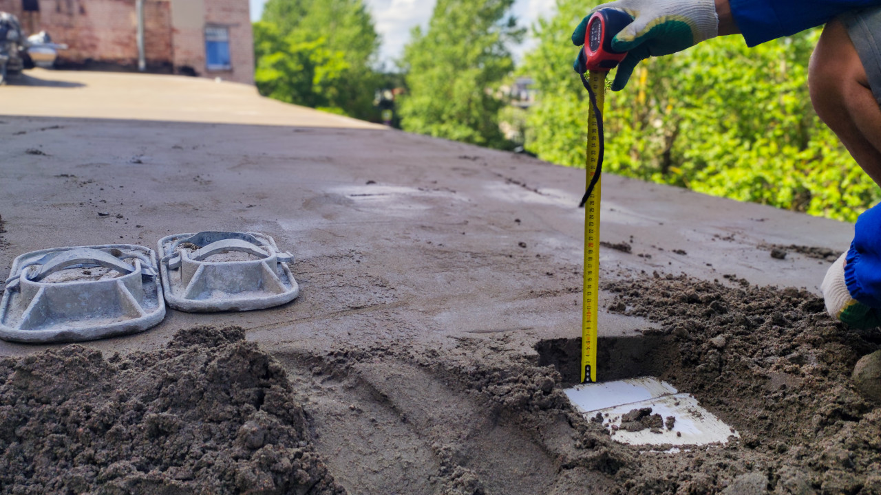 Фотография показывает рабочего в строительных перчатках, который с помощью рулетки проводит измерение толщины уложенной стяжки на кровле. На поверхности крыши видны следы распределённого песка и металлические элементы строительного оборудования. На заднем плане — кирпичные стены здания и зелёные деревья. Изображение отражает этап контроля качества ремонтных работ.