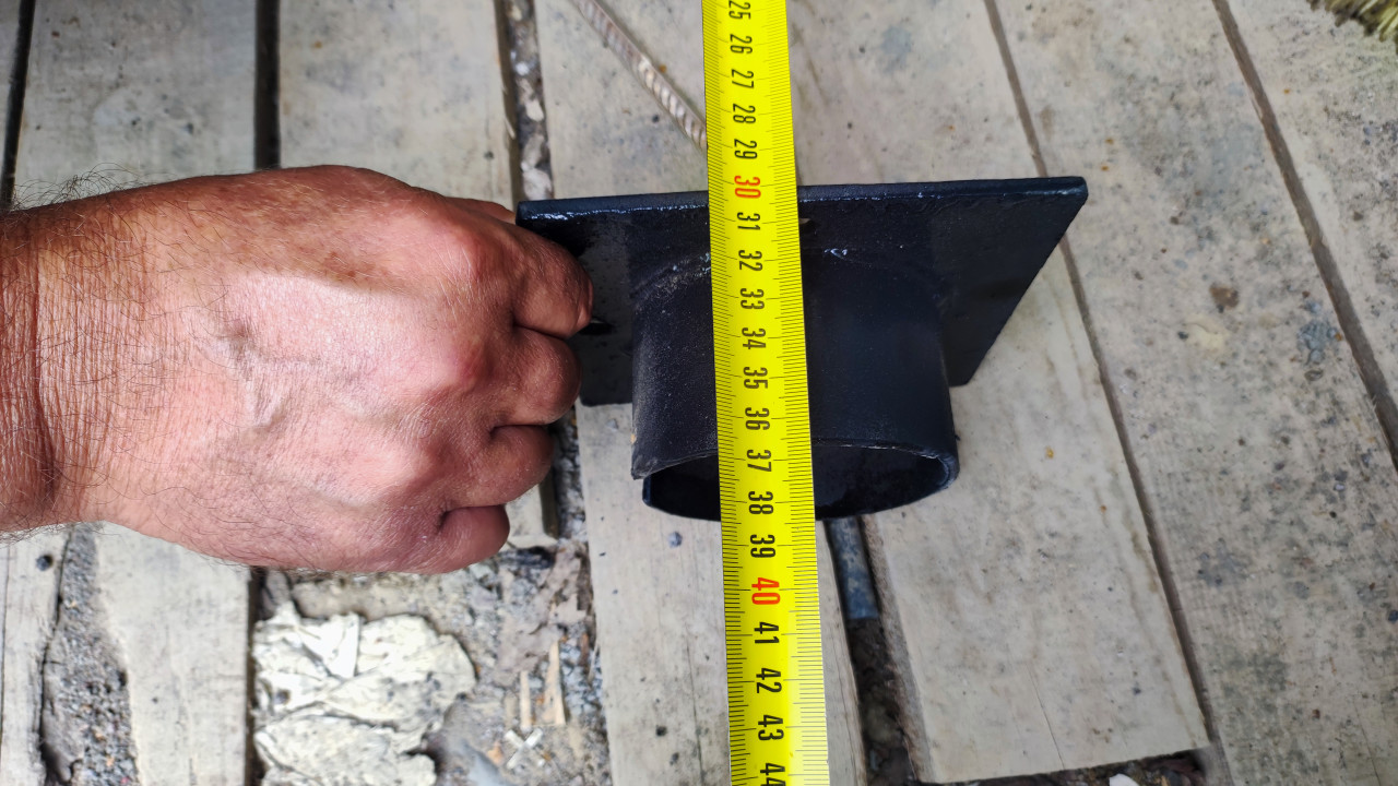 Фотография показывает монтажный стакан для винтовой сваи, закрепленный на квадратной пластине с отверстиями. К детали приложена строительная рулетка, демонстрирующая высоту около 40 см. На фото видно черное защитное покрытие металла и руку человека, удерживающего элемент. Снимок фиксирует процесс подготовки монтажных деталей и может быть использован в статьях о строительстве, инструкциях по установке свайных фундаментов и инженерной документации.