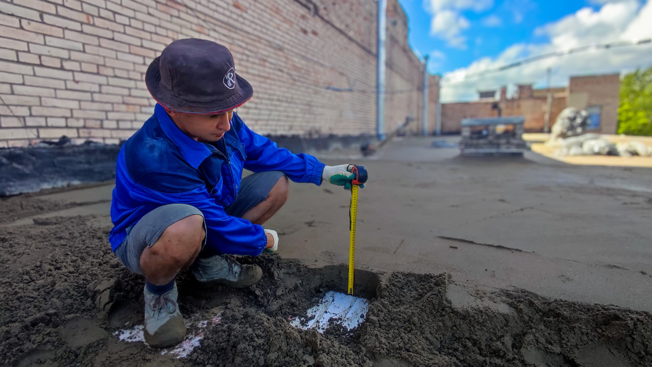 На фотографии изображён строитель, который при помощи рулетки измеряет толщину слоя песчаной стяжки, уложенной поверх утеплителя на крыше здания. Рабочий в защитных перчатках и одежде находится на фоне кирпичной стены. Этот этап является частью контроля качества выполнения ремонтных работ по реконструкции плоской кровли.