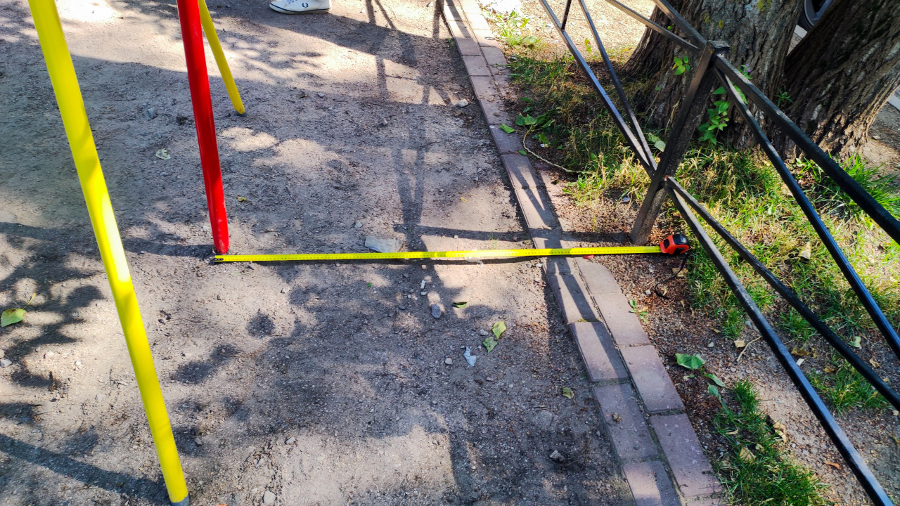 Фотография показывает процесс измерения рулеткой расстояния от красной и жёлтой металлической опоры до чёрного железного ограждения вдоль бордюра. На поверхности площадки видно песчано-гравийное покрытие и небольшие камни. Замеры фиксируют соответствие установки оборудования нормативам безопасности и расположения относительно границ площадки. Снимок иллюстрирует контрольные работы при монтаже детских площадок.