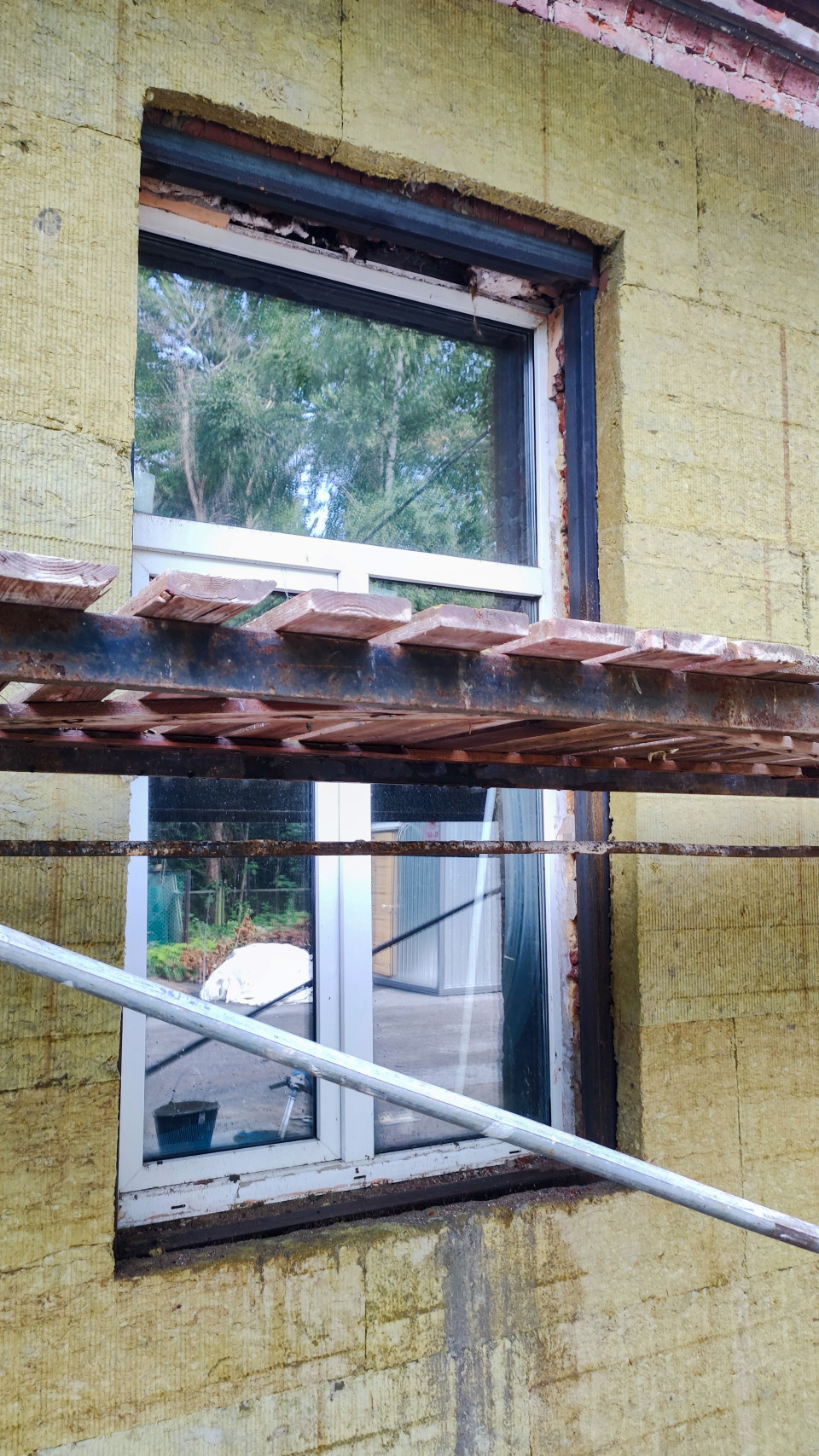 На фото показан фрагмент фасада здания во время утепления. Вокруг пластикового окна смонтированы плиты из каменной ваты, которые закреплены на стене. Перед окном установлены строительные леса с деревянными настилами. Видны элементы старой кирпичной кладки и металлические профили для крепления. Снимок отражает процесс фасадных работ по теплоизоляции здания в жилом квартале.