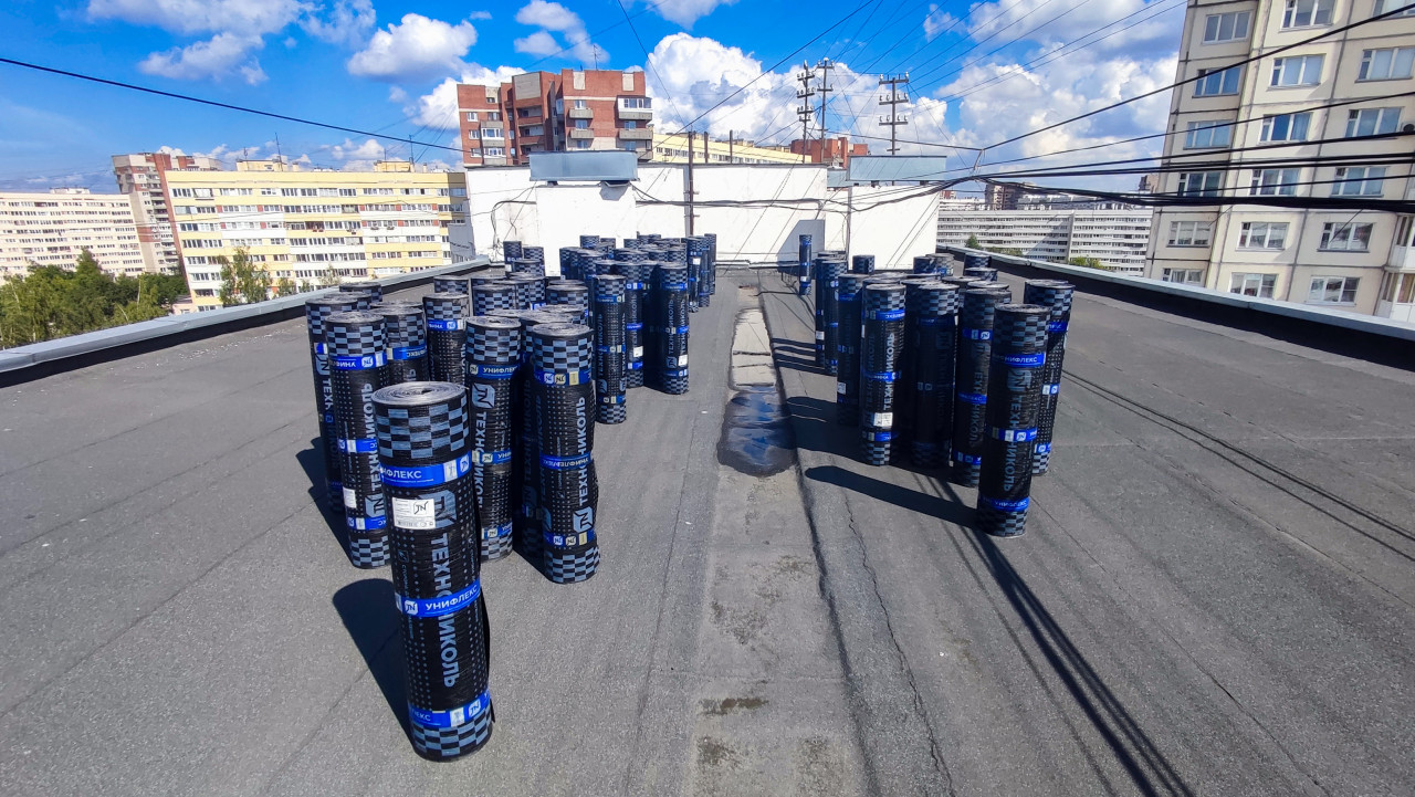 строительные материалы стройматериалы кровельный материал рулоны Технониколь Унифлекс крыша плоская крыша многоквартирный дом рулонное покрытие кровля подготовка к ремонту обслуживание зданий строительные технологии инженерные работы оборудование город панельный дом строительная диагностика поверхность ремонт строительство диагностика инженерное оборудованиеПохожие фотографии