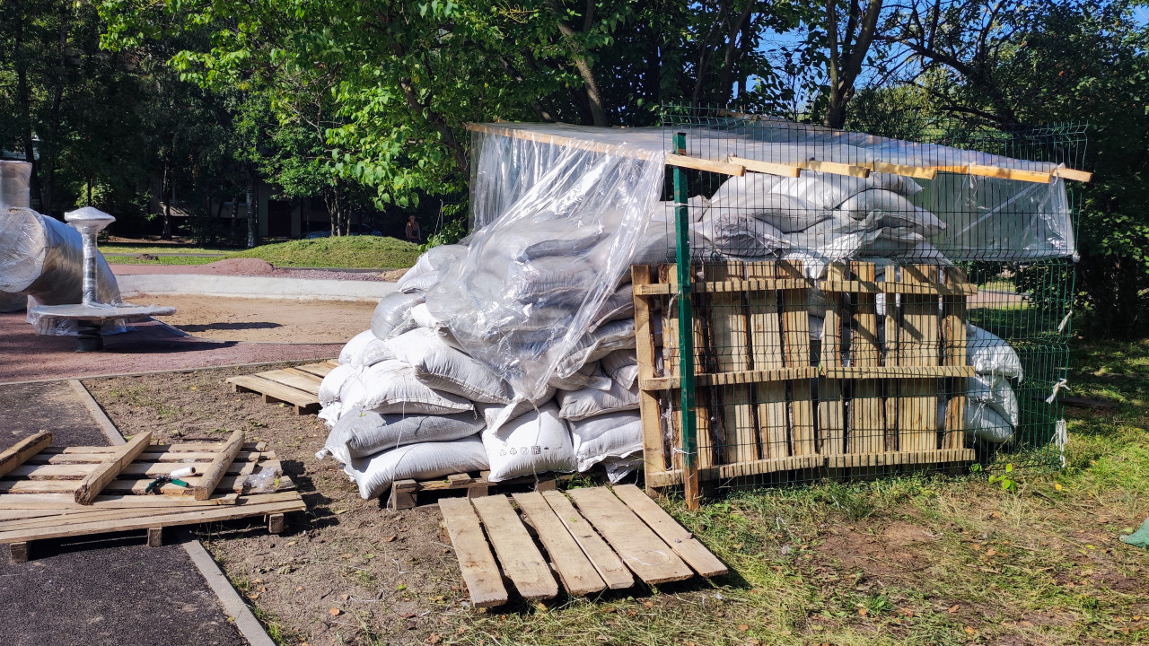На фото изображен временный склад строительных материалов, состоящий из мешков, сложенных в кучу и накрытых полиэтиленовой пленкой. Конструкция защищена деревянными поддонами и сетчатым ограждением. На переднем плане лежат деревянные поддоны и инструменты, рядом видны упакованные элементы, предположительно для благоустройства территории. Фотография иллюстрирует организацию хранения стройматериалов на открытом воздухе во время проведения работ.