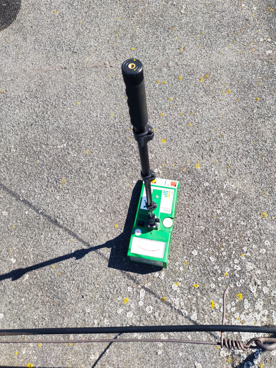 На изображении показан влагомер Tramex с вертикально установленным датчиком. Прибор размещён на плоской крыше, поверхность которой покрыта рулонным материалом. В кадре заметна шкала прибора и сенсорный стержень для замеров. Устройство применяется для обследования влажности кровель и строительных конструкций. Фотография может использоваться в материалах о строительной диагностике и техническом контроле.