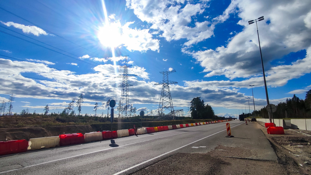 На снимке изображена автодорога с временными барьерами красного и белого цвета, установленных вдоль трассы. На обочине видны бетонные ограждения и уложенные кабельные трубы. Вдоль дороги проходят высоковольтные линии электропередачи, закрепленные на металлических опорах. На заднем плане находится лесной массив. Кадр может быть использован для иллюстрации транспортной инфраструктуры, энергетических объектов и инженерных коммуникаций.