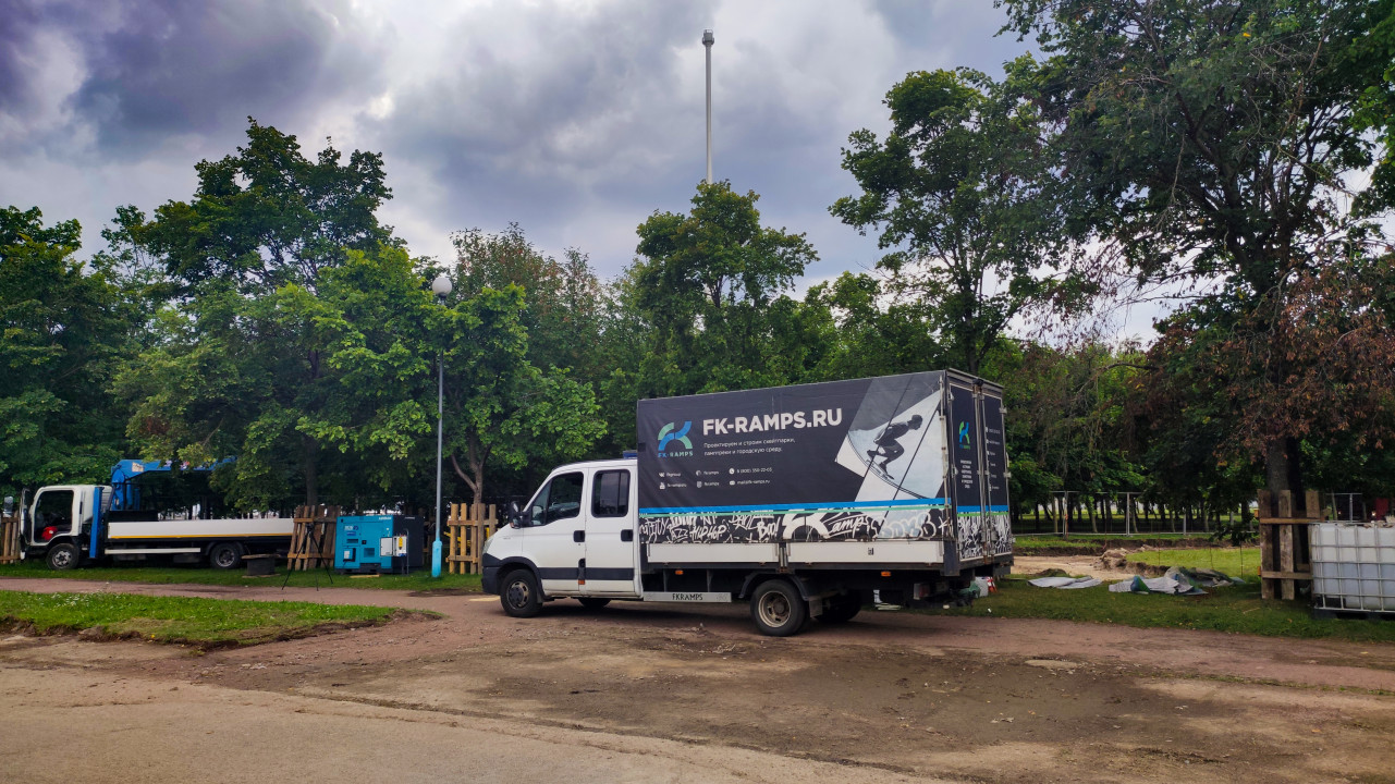 На фотографии показан белый грузовик с тентованным кузовом, на котором размещена реклама компании FK-RAMPS, занимающейся проектированием и строительством скейтпарков и элементов городской среды. Машина стоит на строительной площадке рядом с генератором и другими транспортными средствами. На фоне видны деревья и временные ограждения. Снимок иллюстрирует участие специализированных подрядчиков в городских проектах и может использоваться в темах, связанных с благоустройством и спортивной инфраструктурой.