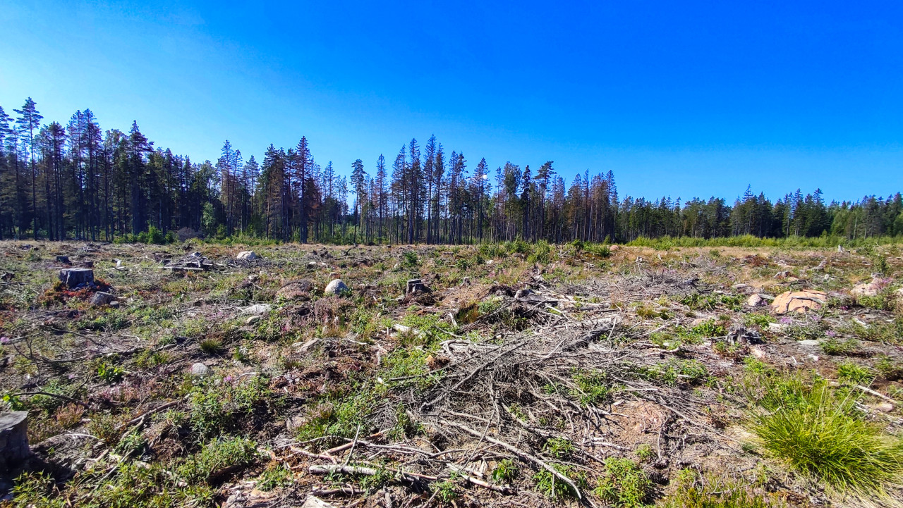 На фото показан участок вырубленного леса, где на переднем плане заметны пни, ветви и сухая трава. Вдали виден сохранившийся массив хвойных деревьев. Снимок иллюстрирует последствия хозяйственной деятельности человека и воздействие вырубки на экосистему леса.