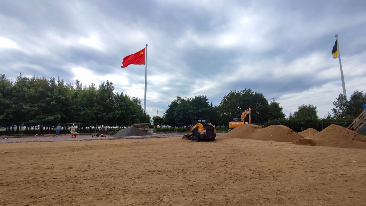 На фотографии изображена строительная площадка в парке, где рабочие продолжают укладку основания для покрытия. На переднем плане виден песчаный грунт и строительная техника — экскаватор и малогабаритный погрузчик. В центре кадра установлен высокий флагшток с красным флагом с серпом и молотом, относящимся к советской символике. На заднем плане также заметен ещё один флагшток с жёлто-синим флагом и зелёные деревья. Снимок отражает сочетание современного строительства и историко-политических символов.