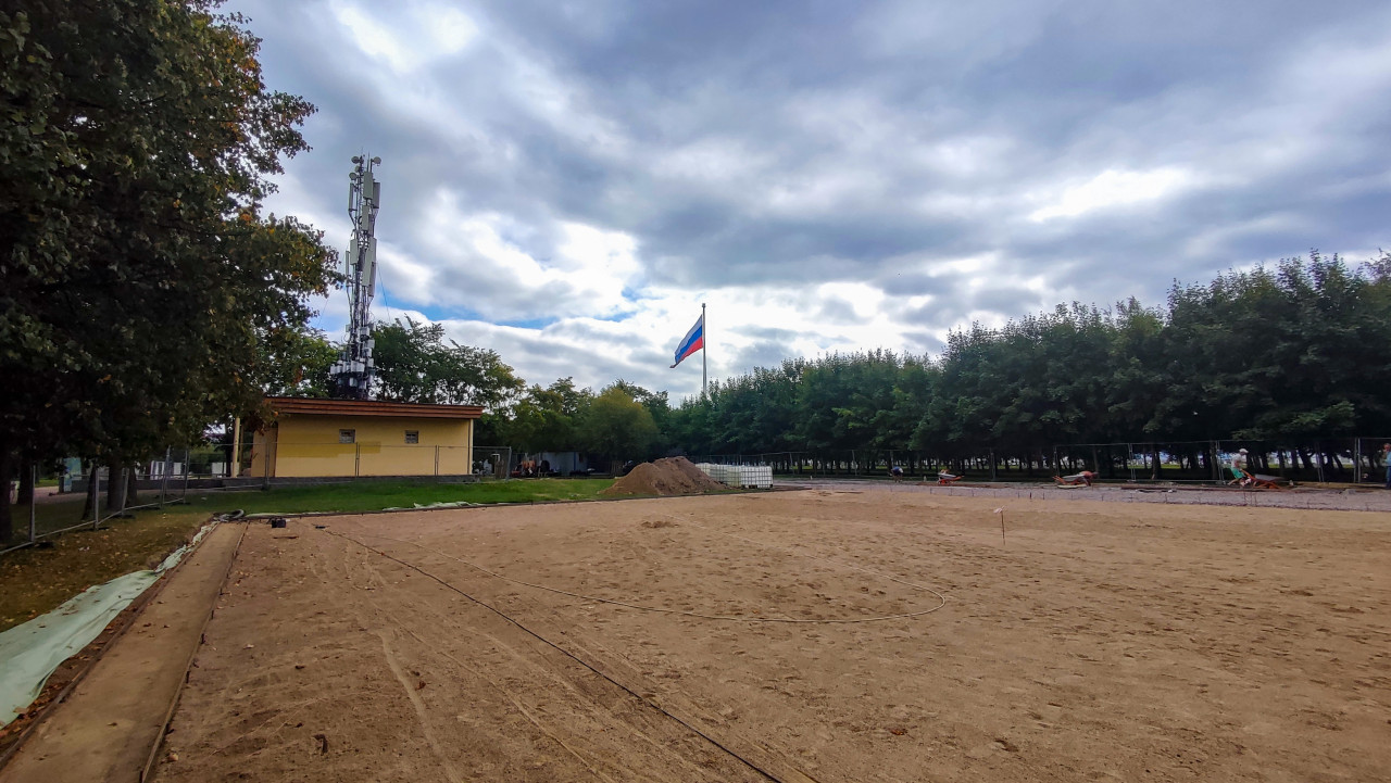 На фото показана подготовка основания для будущего покрытия на территории парка. Передний план занят песчаной площадкой с разметкой и строительными материалами, рядом расположено здание с антенной вышкой. На заднем плане виден российский триколор на высоком флагштоке и деревья вдоль аллеи. Рабочие продолжают строительные работы, перемещая материалы и выравнивая поверхность. Снимок иллюстрирует процесс благоустройства общественного пространства с элементами государственной символики.