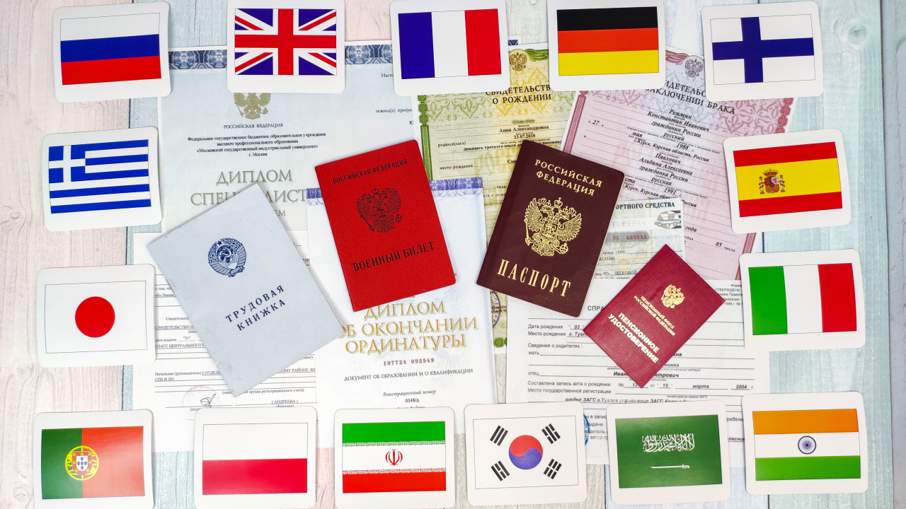 На фото представлены российские документы — паспорт, военный билет, пенсионное удостоверение, дипломы и свидетельства, разложенные на поверхности. Вокруг них размещены карточки с изображениями флагов разных стран: Великобритании, Франции, Германии, Испании, Италии, Финляндии, Греции, Португалии, Японии, Южной Кореи, Саудовской Аравии, Ирана и Индии. Кадр символизирует международный характер документооборота и необходимость легализации бумаг для разных государств.