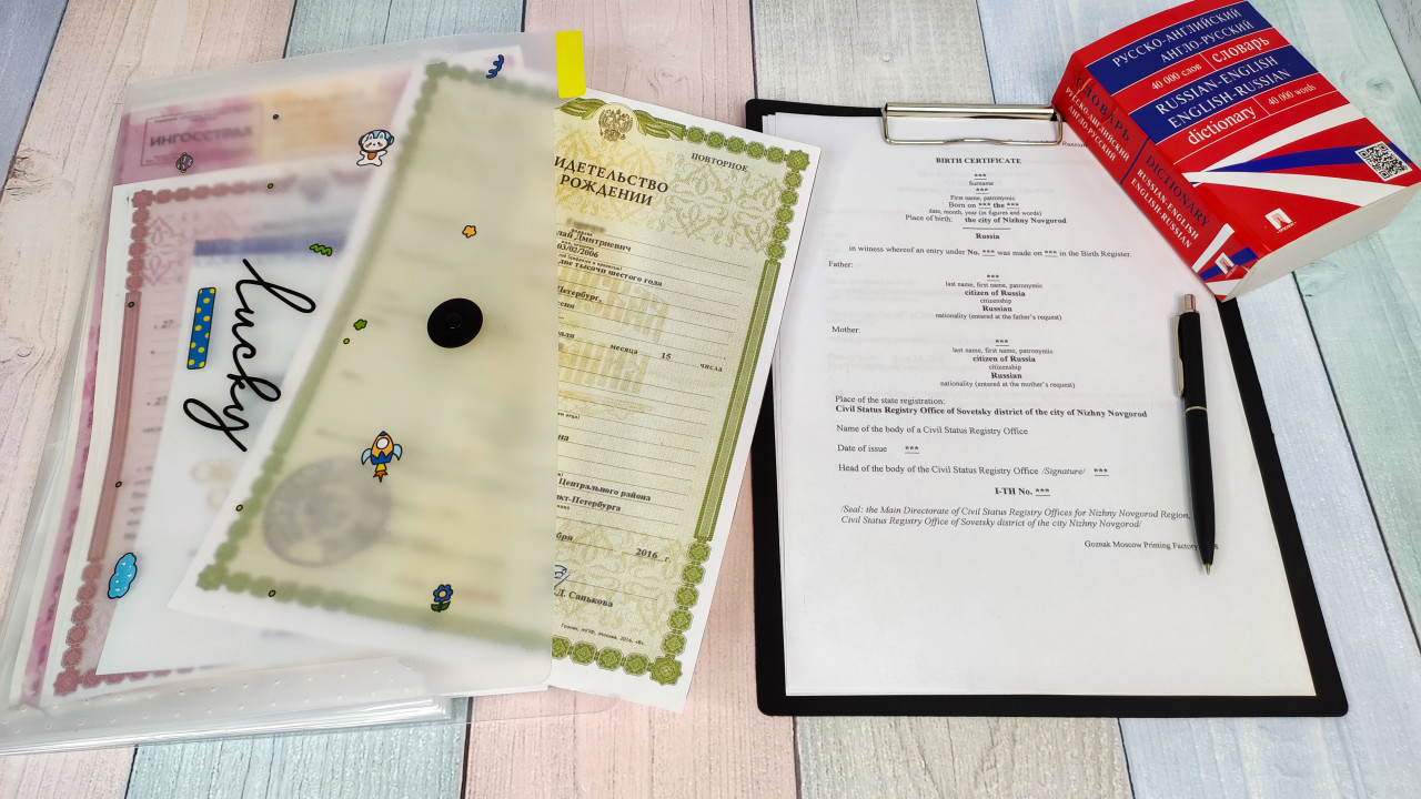 Фотография демонстрирует нотариально заверенный перевод свидетельства о рождении, помещенный в папку с зажимом, рядом со словарем и черной ручкой. Рядом расположена прозрачная папка с надписью «Lucky», в которой собраны оригиналы свидетельств и других бумаг. Кадр иллюстрирует хранение и систематизацию личных документов при оформлении переводов и юридических процедур.
