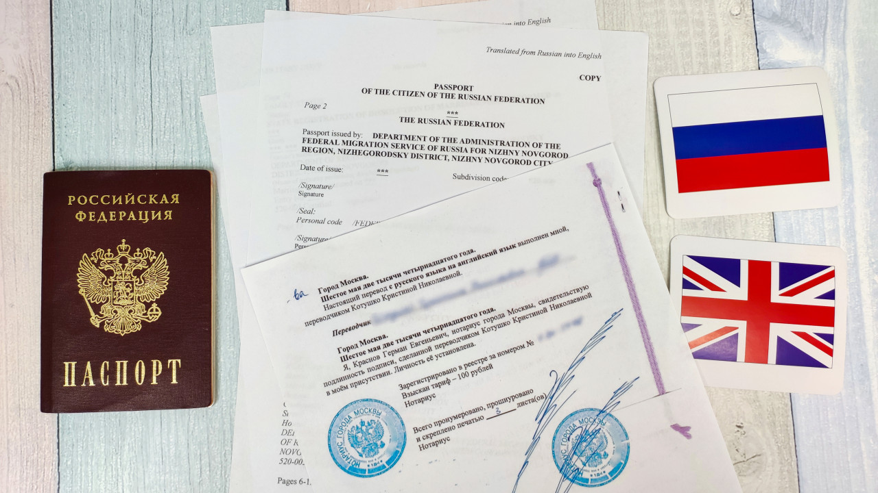 На фотографии представлен паспорт гражданина Российской Федерации бордового цвета с золотым гербом, лежащий рядом с нотариально заверенным переводом документа на английский язык. На листе видны печати нотариуса города Москвы и подписи, подтверждающие подлинность. Также присутствуют карточки с изображением флагов России и Великобритании. Снимок иллюстрирует процесс подготовки документов для международного использования и легализации личных данных.