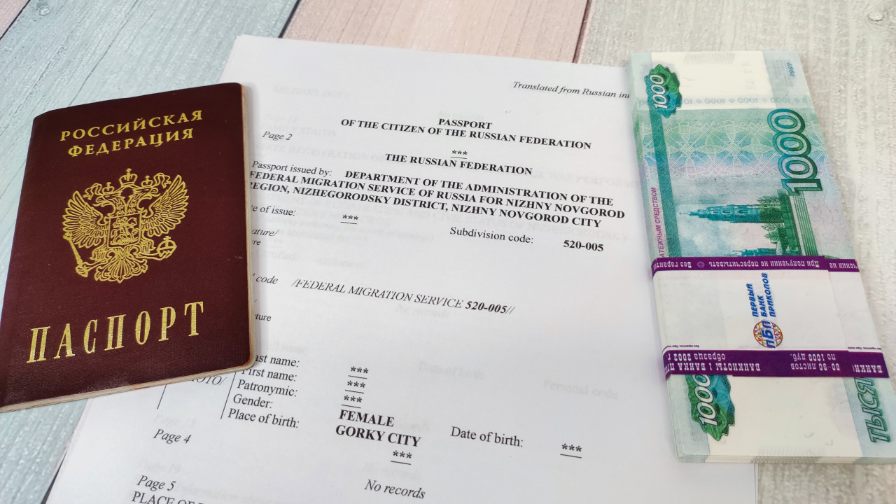 Паспорт России и перевод с копией документа и денежной купюрой