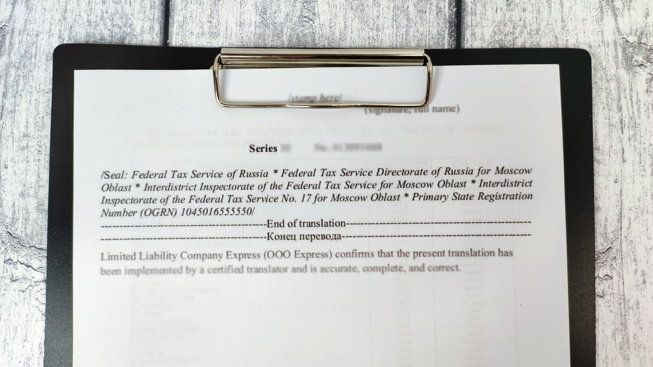 На изображении представлен лист документа с английским текстом и русским переводом, закрепленный на планшете-папке. В тексте содержатся данные о Федеральной налоговой службе России, включая регистрационный номер. Документ снабжен подписью и отметкой о завершении перевода. В кадре отсутствуют дополнительные объекты, акцент сделан на содержании бумаги и ее официальном характере. Фотография подходит для иллюстрации публикаций, связанных с подготовкой и подачей официальных бумаг, нотариальным заверением и международным документооборотом.