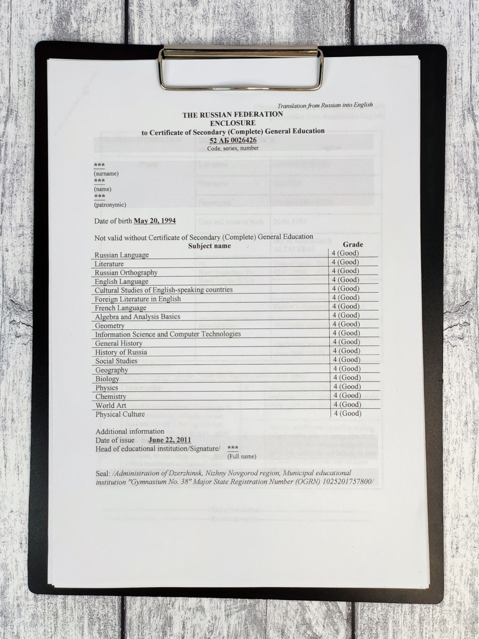 Фотография представляет перевод приложения к аттестату, в котором перечислены школьные предметы, включая русский язык, литературу, математику, физику, химию и другие дисциплины, с итоговыми оценками. Документ выполнен на английском языке и закреплен на планшете. Композиция отражает официальный процесс подготовки образовательных документов для их легализации за границей.