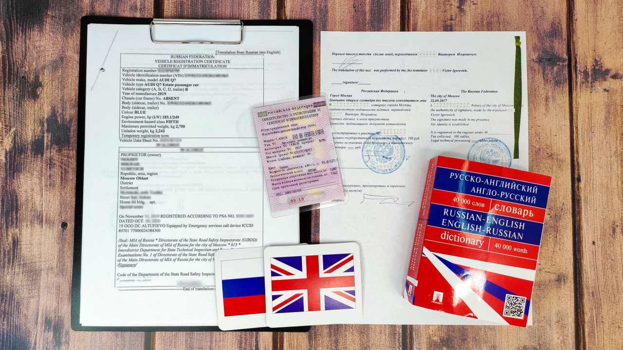 На фото изображены документы, связанные с регистрацией транспортного средства. Слева закреплен на планшете перевод свидетельства о регистрации ТС на английский язык, в центре лежит оригинал пластикового свидетельства розового цвета, справа — лист с нотариальным заверением перевода с печатью и подписью. Рядом также расположен русско-английский словарь и карточки с изображениями флагов России и Великобритании, подчеркивающие международную направленность. Снимок может использоваться в публикациях о нотариальных услугах, регистрации автомобилей и международных процедурах.