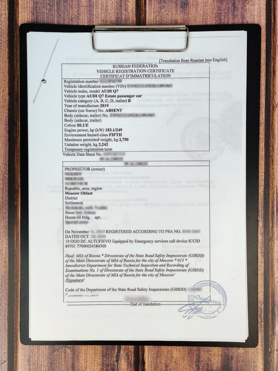 На изображении представлен перевод свидетельства о регистрации транспортного средства на английский язык, закрепленный на планшете. Документ содержит данные о марке, модели, номере кузова, цвете и характеристиках автомобиля. В нижней части видна печать, подтверждающая юридическую силу перевода. Фото может быть использовано в публикациях о регистрации автомобилей, нотариальном переводе и международных автомобильных документах.