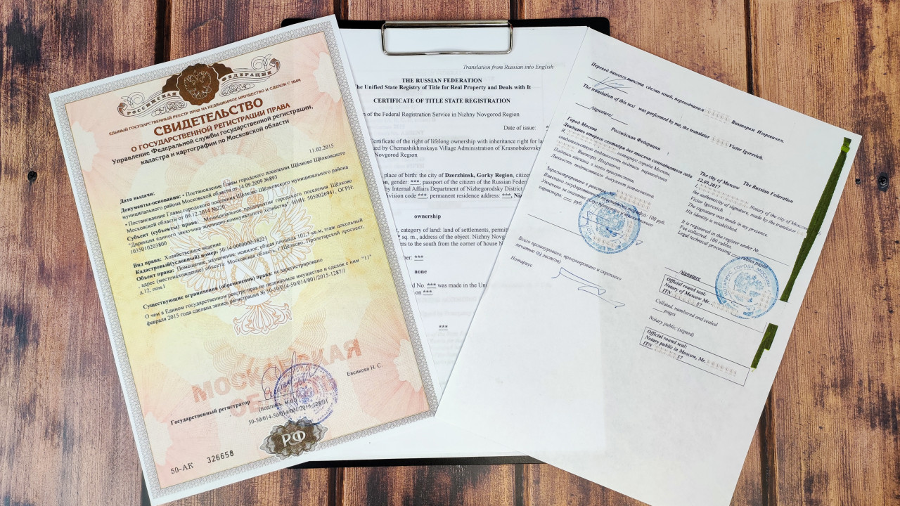Свидетельство о регистрации права и нотариальный перевод с печатями