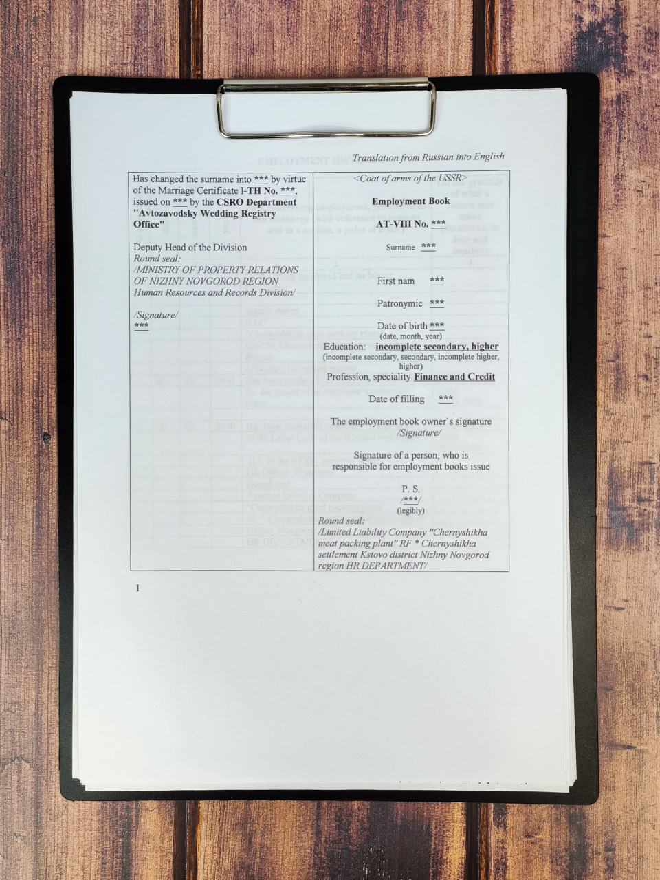 На изображении представлен лист с переводом первой страницы трудовой книжки на английский язык, где указаны личные данные, образование и профессия. Документ закреплён на клипборде, лежащем на деревянной поверхности. В тексте видны упоминания Министерства имущественных отношений Нижегородской области и брачного свидетельства, что указывает на нотариально заверенный характер перевода. Фотография подходит для публикаций о переводе личных документов, нотариальных услугах и подтверждении квалификации при трудоустройстве за границей.