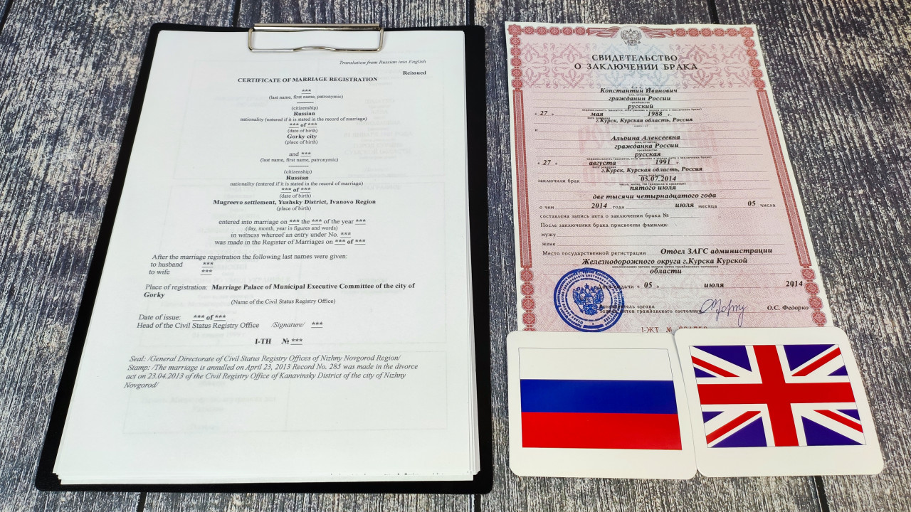 Свидетельство о браке и перевод документа с флагами России и Великобритании