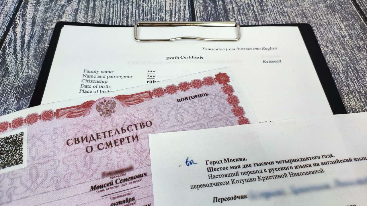 Свидетельство о смерти и нотариально заверенный перевод с печатью нотариуса