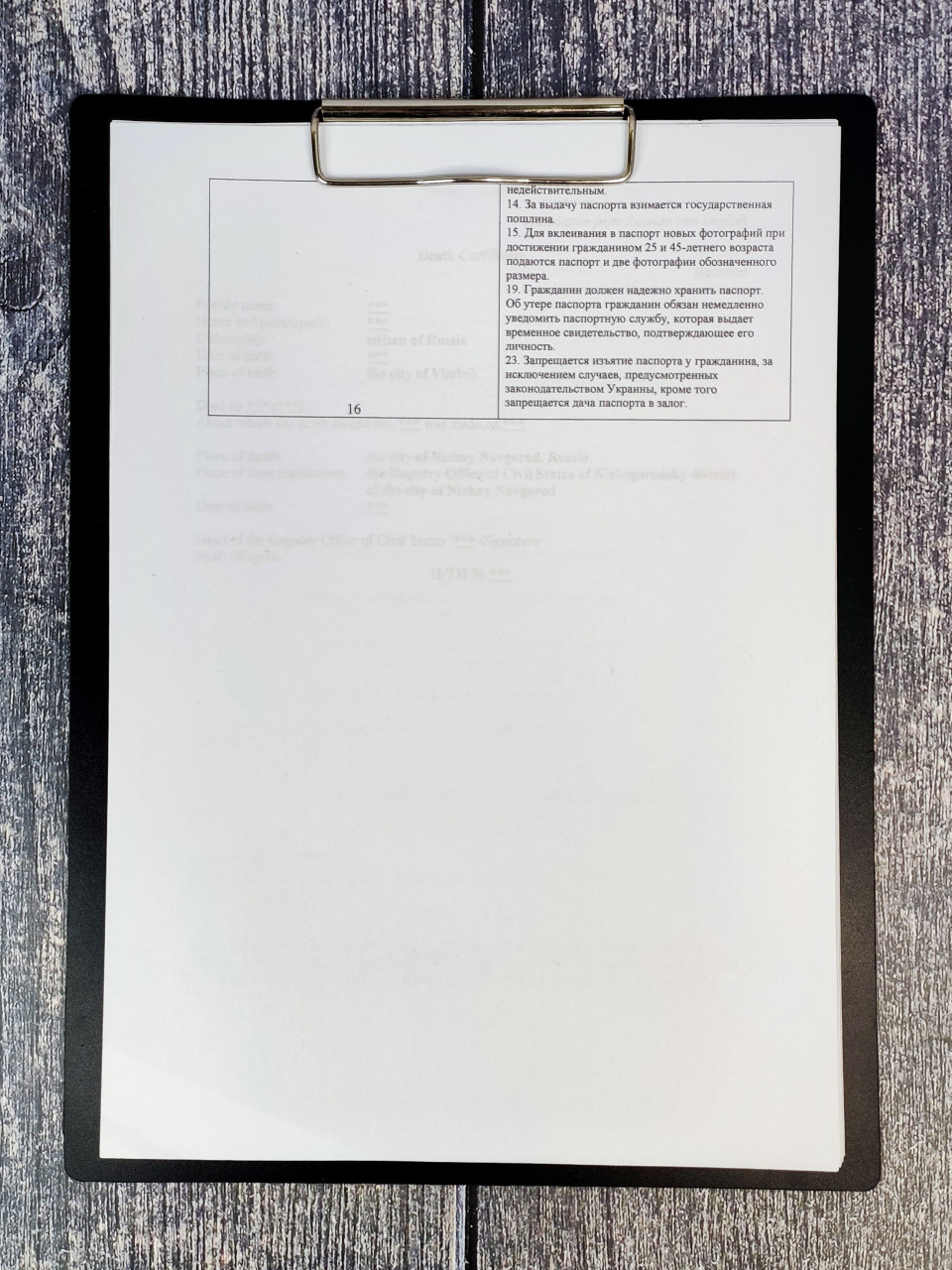 На фотографии изображён лист перевода с украинского паспорта, закреплённый на планшете с металлическим зажимом. На документе виден текст, содержащий выдержки из нормативных положений о правилах пользования паспортом гражданина Украины, включая порядок замены фотографий и хранения документа. Бумага размещена на деревянной поверхности серого цвета, создающей деловой нейтральный фон. Снимок можно использовать в публикациях о паспортных нормах, юридических процедурах, миграционных вопросах и документообороте.