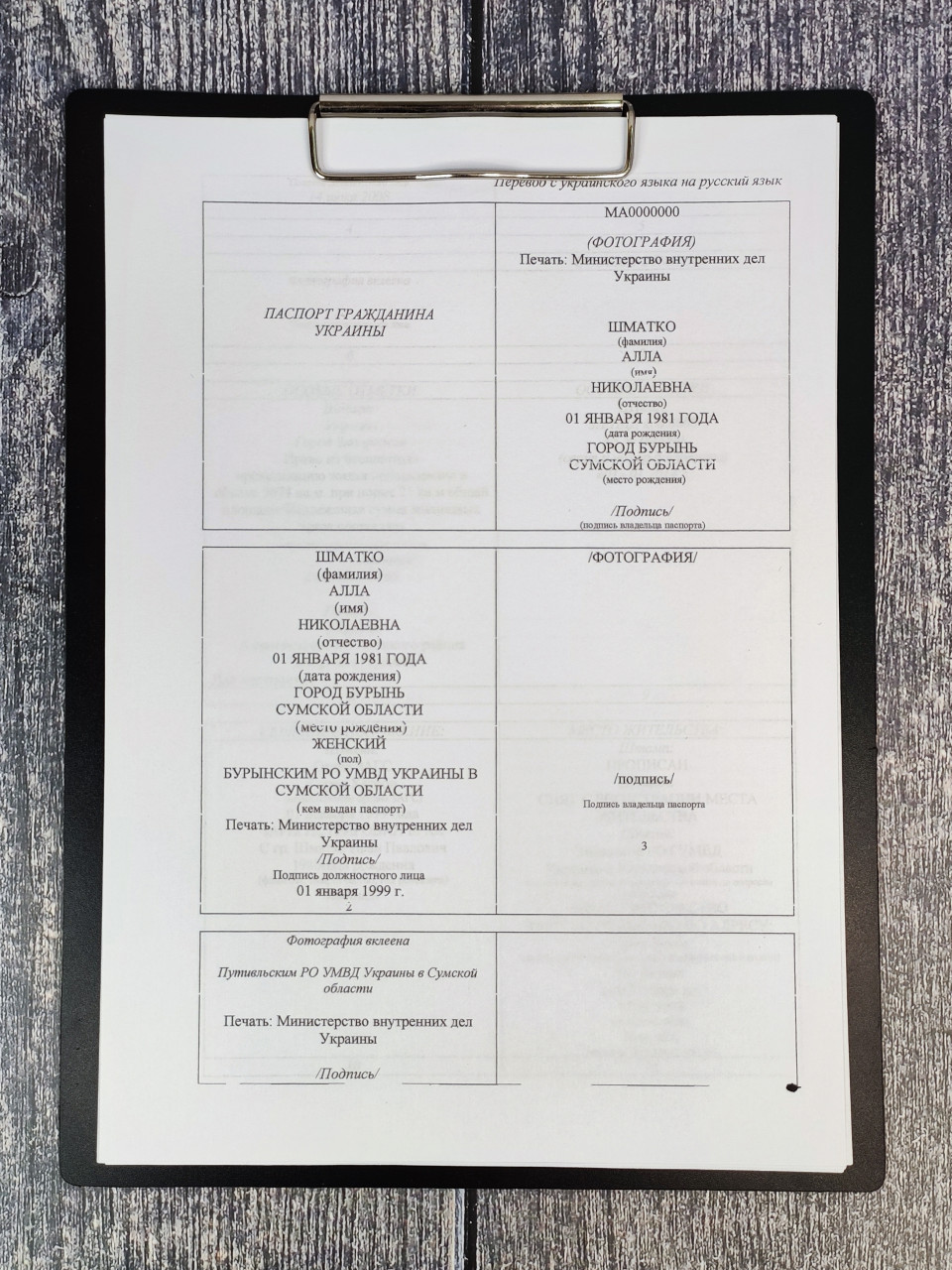 Перевод первой страницы украинского паспорта с личными данными владельца