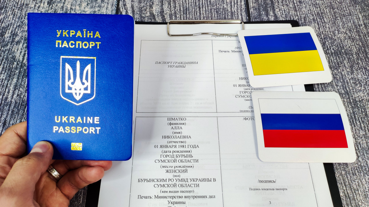 Украинский паспорт и документ с личными данными на фоне флагов Украины и России