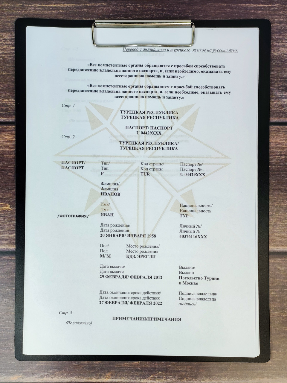 На фотографии изображён перевод турецкого паспорта на русский язык, выполненный на официальном бланке и закреплённый на планшете с зажимом. В тексте указано «Турецкая Республика», фамилия, имя, дата рождения, место рождения, даты выдачи и окончания срока действия паспорта. Документ иллюстрирует процедуру перевода личных данных и подтверждения подлинности заграничных паспортов. Фото может использоваться в темах миграции, оформления виз и нотариальных услуг.