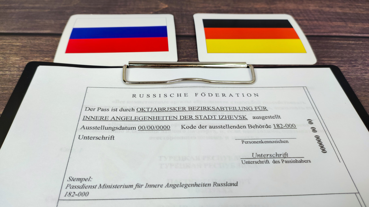 На фотографии изображён лист с переводом данных российского паспорта на немецкий язык, закреплённый на планшете с металлическим зажимом. В верхней части кадра видны карточки с флагами России и Германии. В тексте документа указаны поля «Familienname», «Vorname», «Geburtsort» и другие типичные элементы немецкой формы. Снимок иллюстрирует процесс перевода и легализации документов для использования в Германии. Может использоваться в статьях о миграции, визах и международных процедурах.