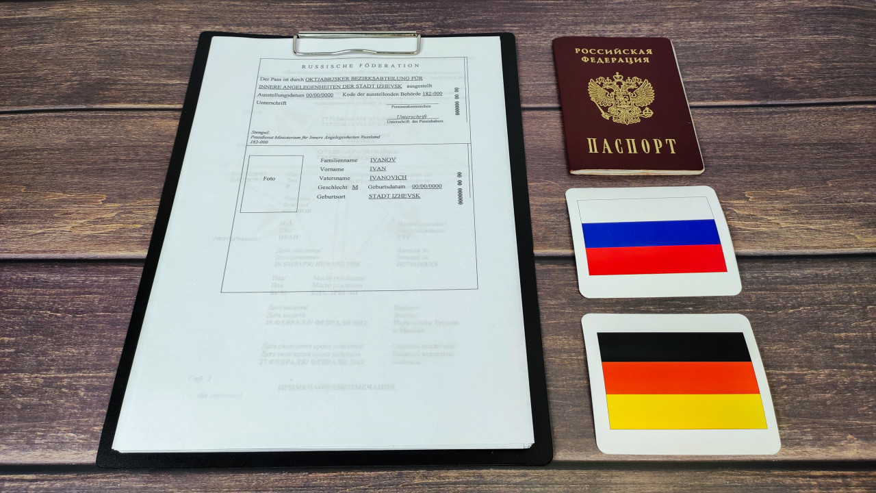 Российский паспорт и перевод документа на немецкий язык с флагами России и Германии