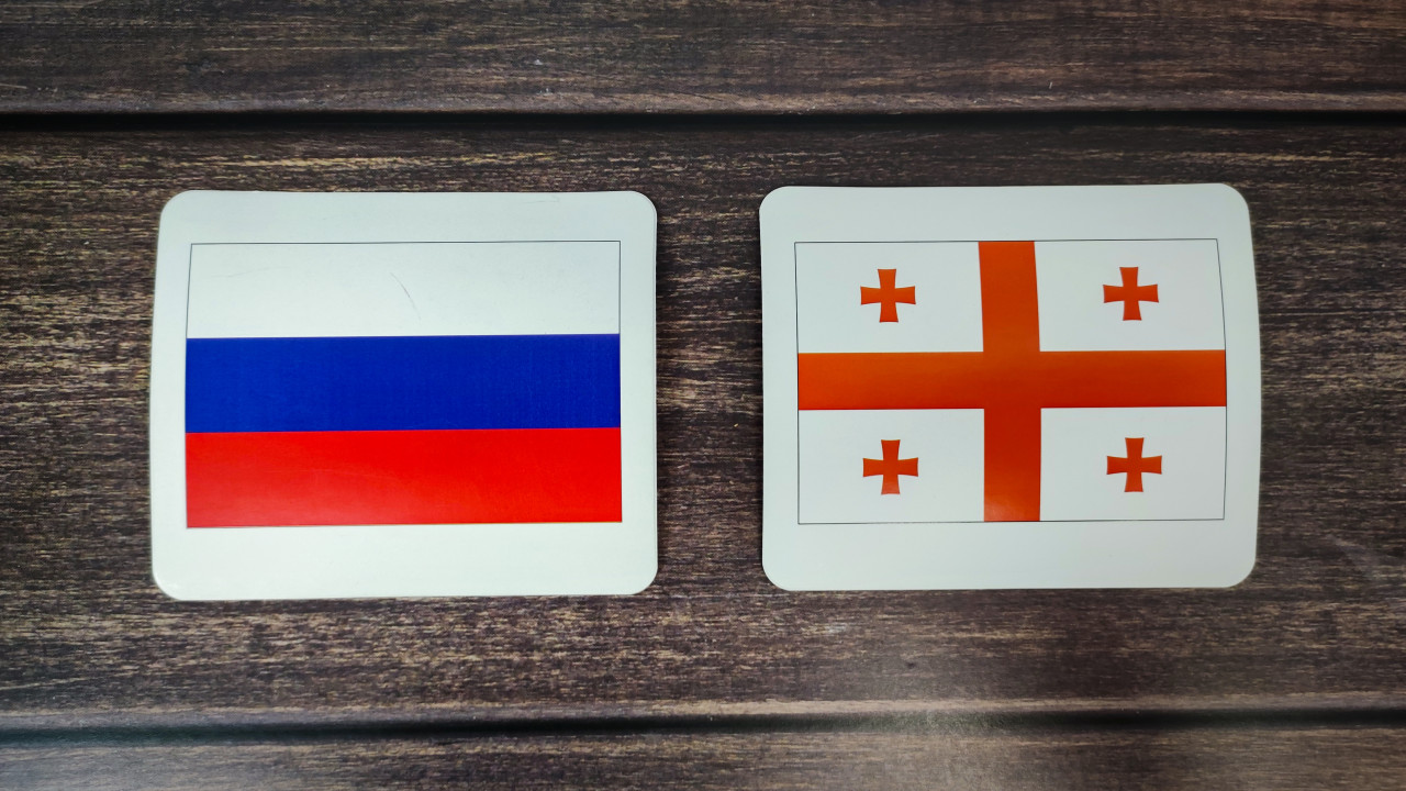 На изображении представлены две карточки с изображениями государственных флагов России и Грузии, расположенные рядом на деревянной поверхности. Флаг России состоит из трёх горизонтальных полос — белой, синей и красной. Флаг Грузии включает красный крест Святого Георгия и четыре малых креста. Снимок иллюстрирует международные отношения, дипломатические темы, культурное и историческое взаимодействие между странами. Подходит для статей о внешней политике и межгосударственном сотрудничестве.