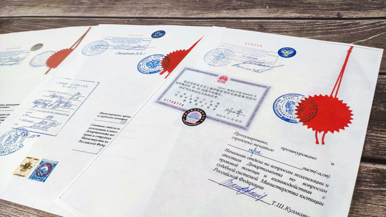 Фотография запечатлела несколько листов официальных документов, прошнурованных и скреплённых красными гербовыми наклейками. На каждом листе видны печати Министерства иностранных дел России, Министерства юстиции и иностранных представительств. Встречаются штампы консульств Египта, ОАЭ и Китая, а также марки и подписи должностных лиц. Бумаги разложены на деревянной поверхности. Снимок документирует визуальные признаки международной легализации, где видны все атрибуты официальности — гербовые печати, голограммы, регистрационные номера. Изображение подходит для иллюстраций статей о межгосударственном документообороте и правовой сертификации.
