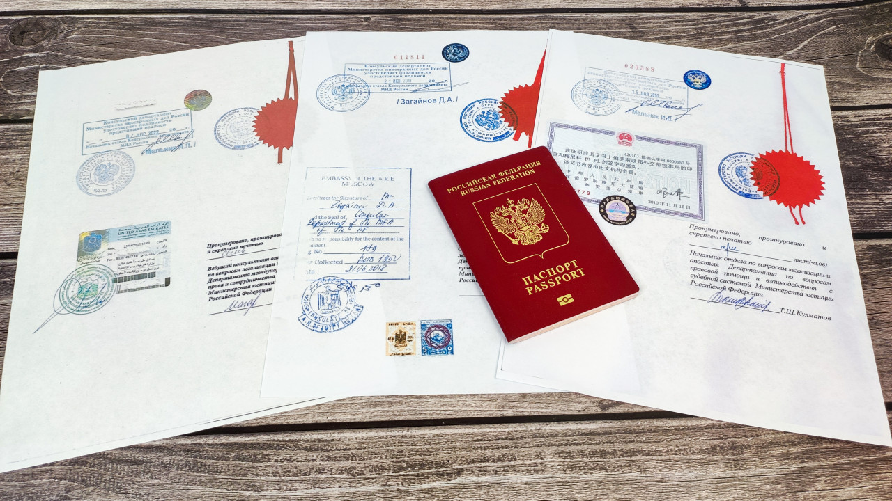 На изображении разложены несколько официальных документов, прошнурованных и скреплённых гербовыми печатями Министерства юстиции и Министерства иностранных дел России. На переднем плане — биометрический заграничный паспорт Российской Федерации, лежащий на бумагах. На документах видны печати консульских отделов, марки и штампы иностранных представительств, включая Китай и ОАЭ. Бумаги размещены на деревянной поверхности. Фото визуализирует процедуру международной легализации и консульского подтверждения документов, что актуально для публикаций о визовой поддержке, миграционных услугах и юридических процедурах за рубежом.