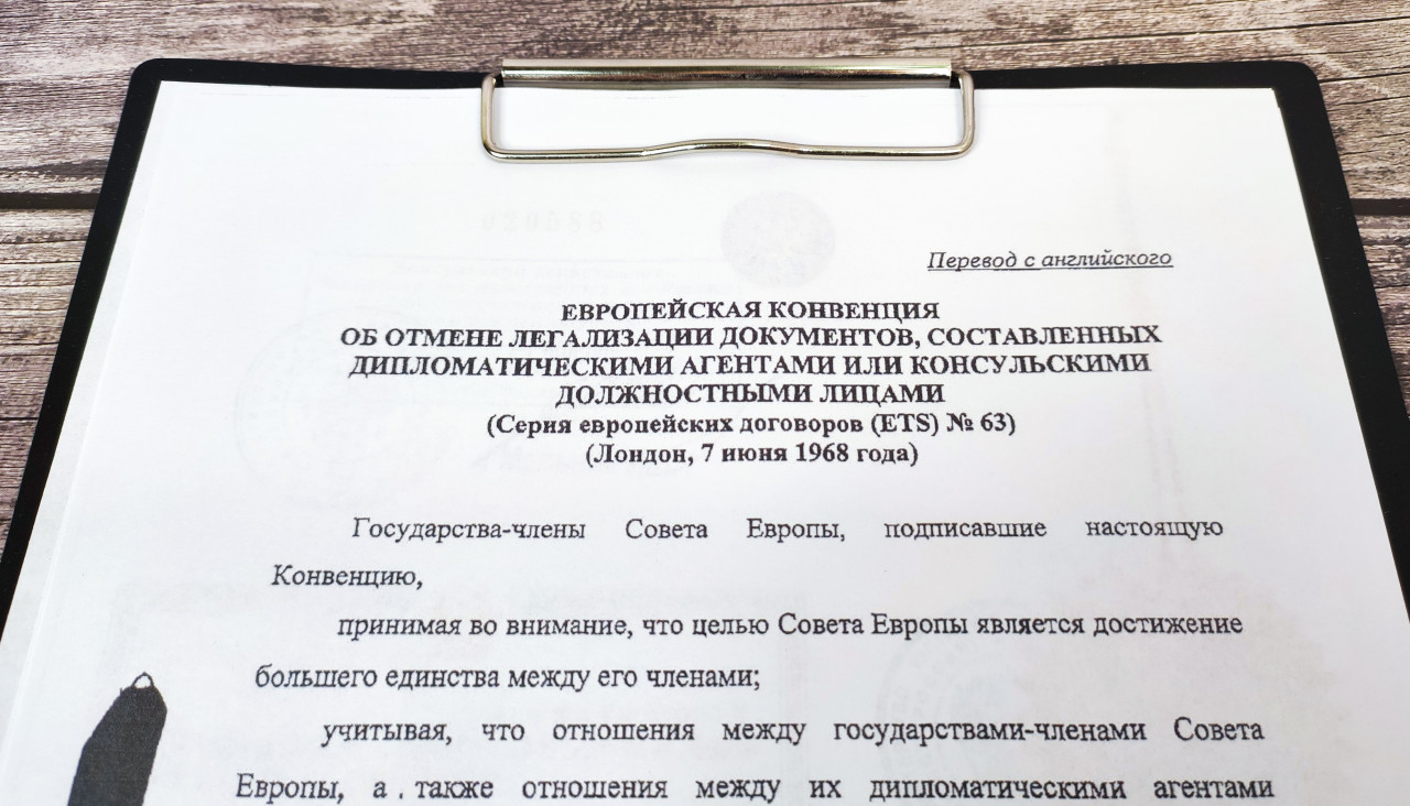 На изображении представлен документ под металлическим зажимом — текст Европейской конвенции об отмене легализации документов, составленных дипломатическими или консульскими должностными лицами. В заголовке указано место и дата подписания — Лондон, 7 июня 1968 года. Бумага лежит на деревянной поверхности, текст отпечатан на русском языке с переводом с английского. Этот международный договор, заключённый в рамках Совета Европы, определяет правила взаимного признания официальных документов без дополнительной легализации. Фотографию можно использовать в публикациях о международном праве, консульских отношениях и юридических стандартах Европы.