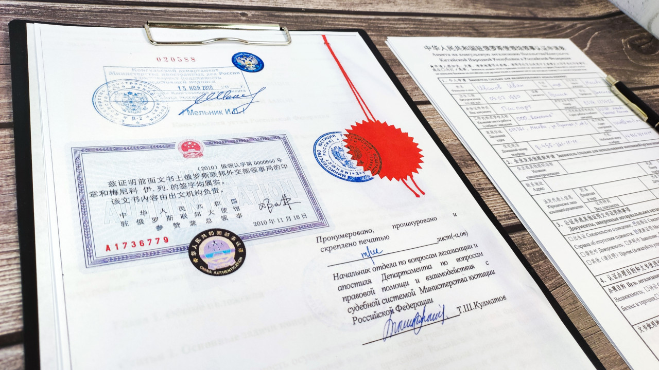 Легализованный документ с печатями России и Китая рядом с анкетой заявителя