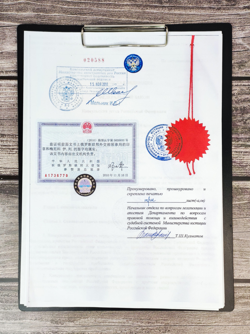 Подшитый документ с печатями Министерства юстиции и консульства Китая