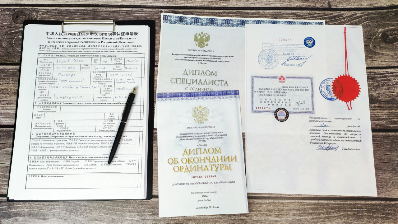 На фото размещены три группы бумаг: анкета на консульскую легализацию, два диплома российского вуза и документ с печатями Министерства юстиции и консульства Китая. На анкете видна ручная подпись, справа — подшитый документ с красной гербовой наклейкой, а между ними — диплом специалиста и диплом об окончании ординатуры. Сцена сфотографирована на деревянной поверхности, при дневном освещении. Изображение можно использовать для статей о легализации дипломов, подтверждении образования за рубежом и международных консульских процедурах.