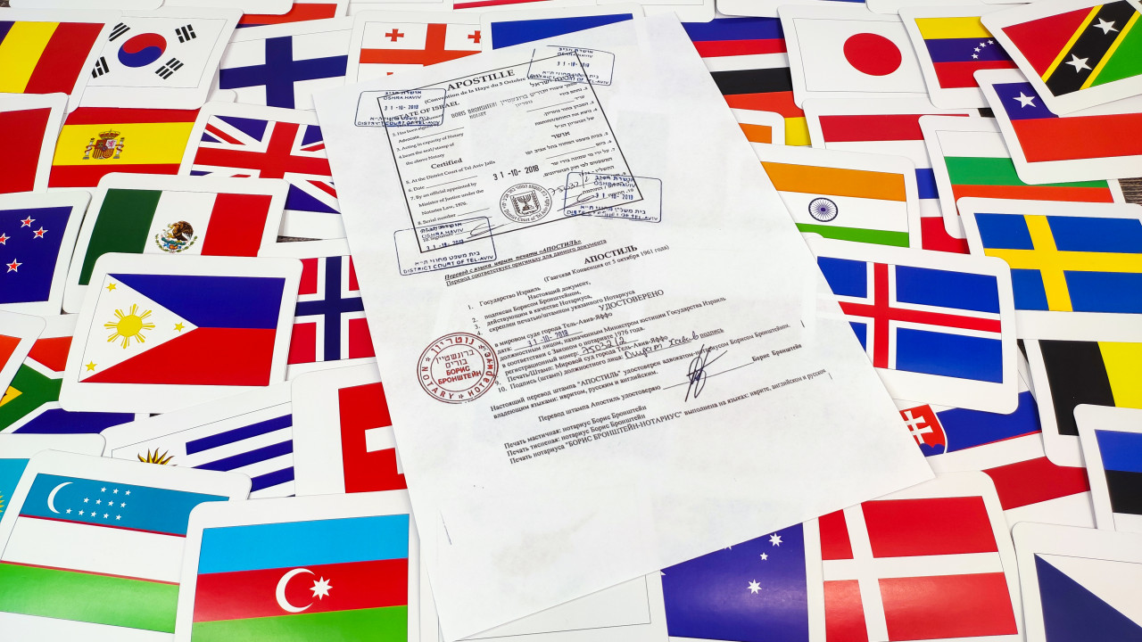 На фотографии изображён официальный документ с апостилем, выданным израильскими нотариальными органами, расположенный на фоне множества карточек с флагами разных государств — Великобритании, Испании, Индии, Японии, Швеции, Новой Зеландии и других. Композиция символизирует международное признание юридических документов в рамках Гаагской конвенции 1961 года. Фото может использоваться для статей о международном праве, консульской деятельности, миграционных услугах и подтверждении документов для работы или обучения за рубежом.