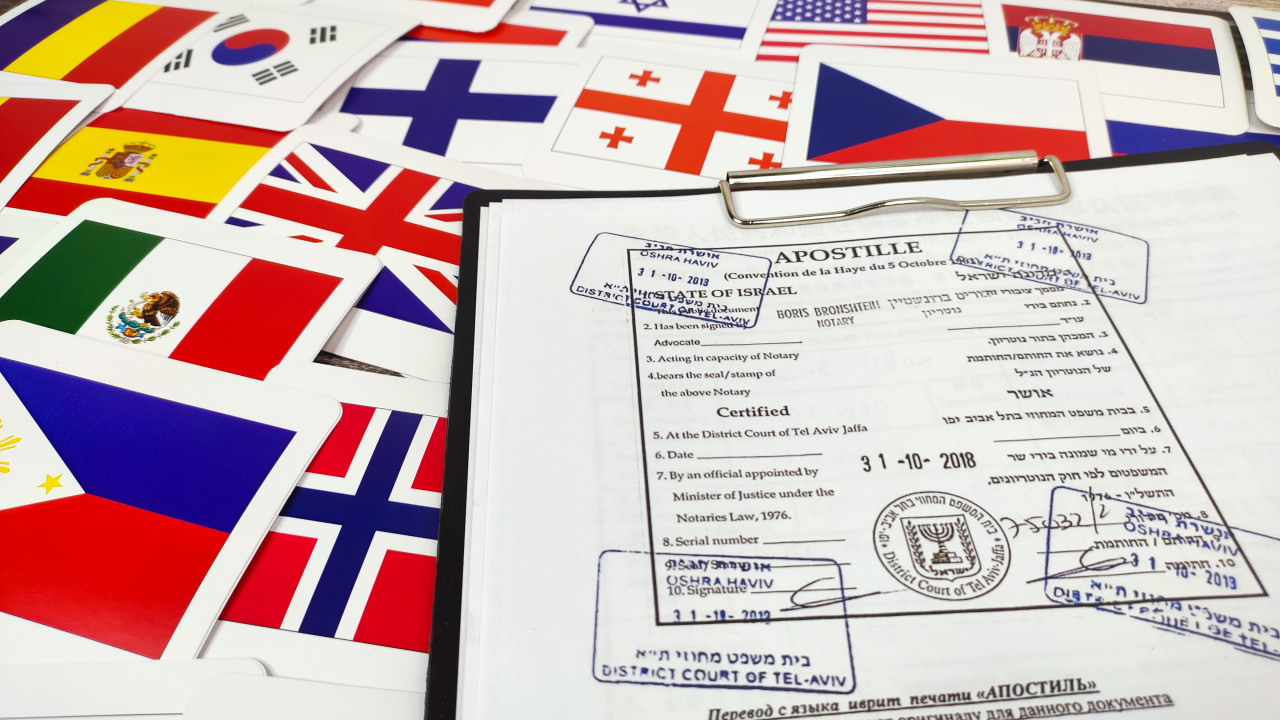 На фотографии показан документ с апостилем, выданным Государством Израиль, размещённый на планшете поверх множества карточек с флагами различных стран. На документе видны печати и подписи, подтверждающие нотариальное заверение и государственную легализацию в соответствии с Гаагской конвенцией 1961 года, отменяющей требование консульской легализации иностранных официальных документов. Вокруг лежат карточки с флагами Великобритании, Финляндии, Южной Кореи, Грузии, США, Мексики и других стран, символизирующие международный характер правового признания апостиля. Фотография может использоваться в материалах о международном документообороте, консульской практике, нотариальных услугах и юридическом сопровождении документов за рубежом.