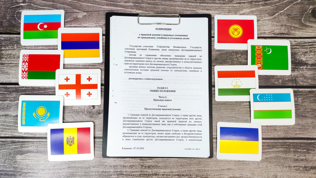 На изображении представлен текст Конвенции о правовой помощи и правовых отношениях по гражданским, семейным и уголовным делам, подписанной в рамках СНГ. Документ закреплён на планшете, а вокруг него расположены карточки с флагами государств-участников — Азербайджана, Армении, Беларуси, Казахстана, Кыргызстана, Молдовы, Таджикистана, Туркменистана, Узбекистана, Украины и Грузии. Бумага содержит статью 1, описывающую положения о предоставлении правовой помощи гражданам договаривающихся сторон. Фон из деревянных досок придаёт фотографии деловой и официальной атмосферы. Снимок может использоваться в материалах о международном праве СНГ, межгосударственном сотрудничестве и правовой интеграции на постсоветском пространстве.