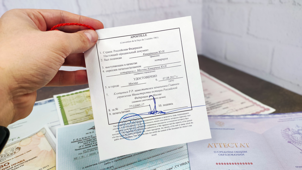 На фотографии изображён апостиль Российской Федерации, удерживаемый рукой над набором официальных документов — дипломом, свидетельством о браке, аттестатом и другими бумагами с гербами и печатями. Красная нить, скрепляющая листы, подчёркивает подлинность и формальность процедуры. Сцена символизирует завершающий этап нотариального удостоверения и подтверждения легальности документов для международного использования. Фото подходит для тем нотариата, международного права, миграционных процедур и консульской практики.
