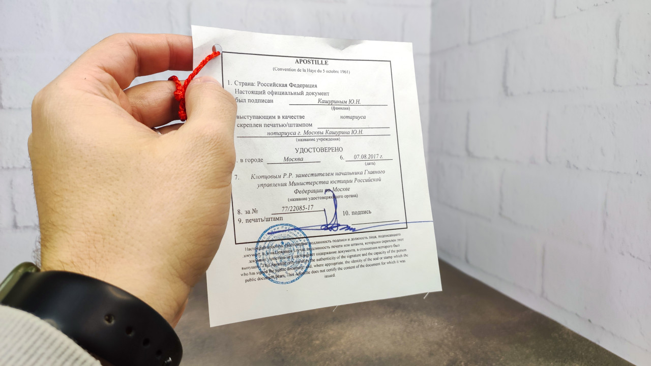 Апостиль Российской Федерации в руке человека на фоне белой стены