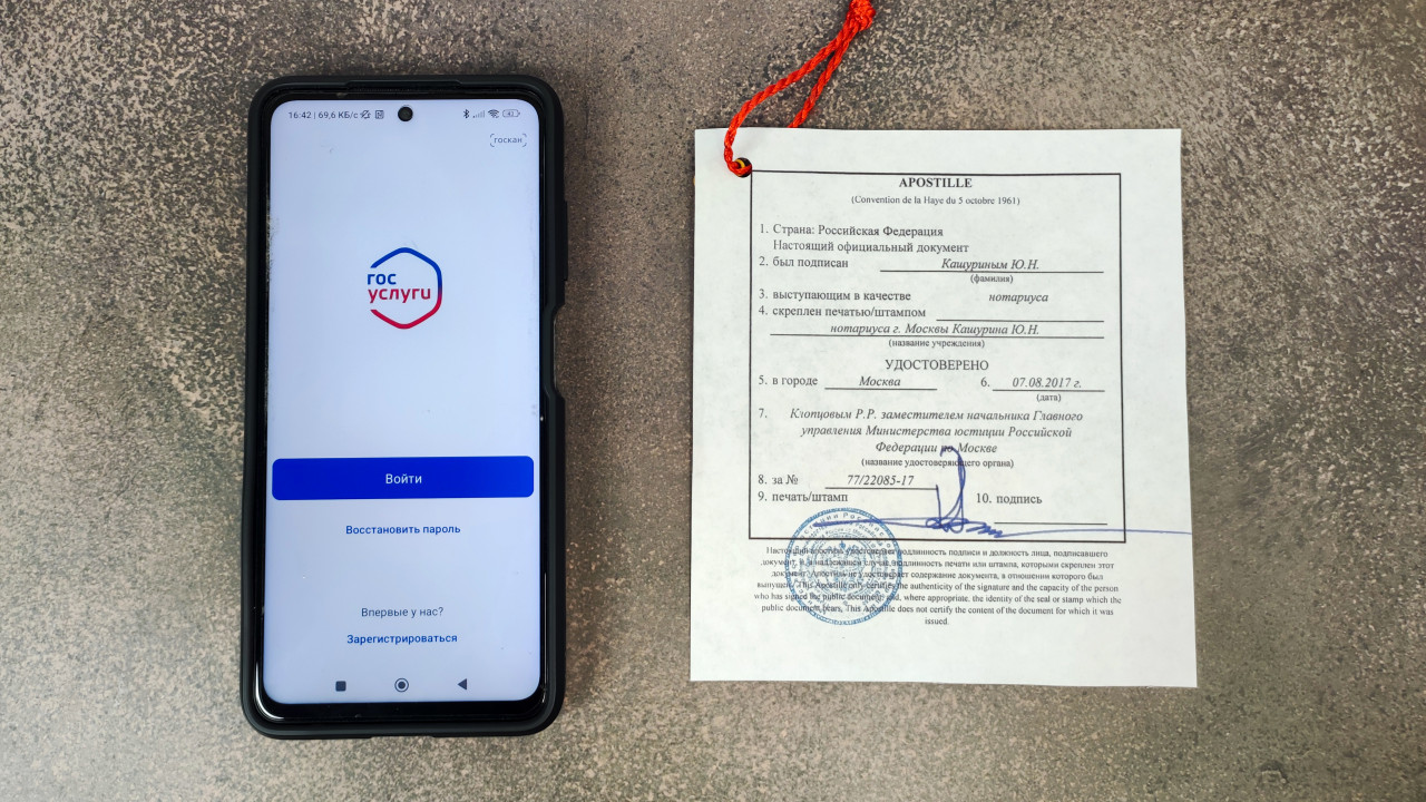На фото изображён смартфон с открытым приложением «Госуслуги» на экране входа, рядом расположен документ с апостилем Российской Федерации, прошитый красной нитью. Композиция символизирует сочетание традиционных бумажных процедур и современных цифровых сервисов. Снимок отражает процесс получения государственных услуг онлайн, включая подачу заявлений на легализацию документов. Подходит для иллюстраций тем цифровизации госуслуг, нотариата и правовых процессов.