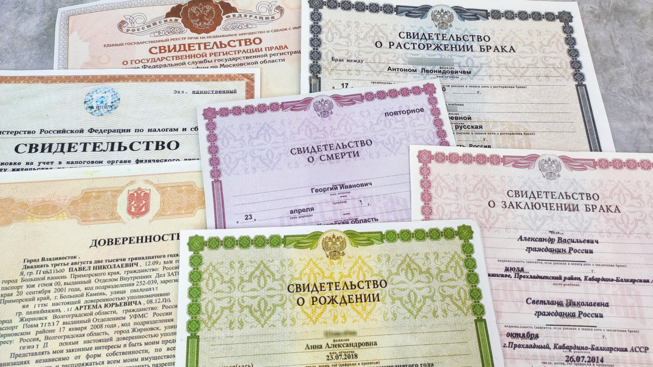 набор документов комплект документов документы стопка документов свидетельство о рождении свидетельство о браке свидетельство о расторжении брака свидетельство о смерти свидетельство о регистрации права доверенность нотариус ЗАГС регистрация актов официальные бумаги юридические документы государственная регистрация гербовая печать Россия удостоверение архив государственная услуга нотариальные действия гражданское состояние легализация документов бумажная работа деловой стол образец документа оформление бумаг подтверждение факта госуслуги ЗАГС РФ апостилированиеПохожие фотографии